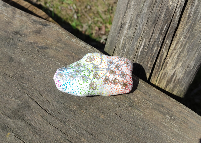 Deze regenboog met bloemetjes steen begint aan zijn reis in de Bospolder in Ekeren. In het midden van deze groene vlakte werd hij neergelegd op een bank met uitzicht op de haven.